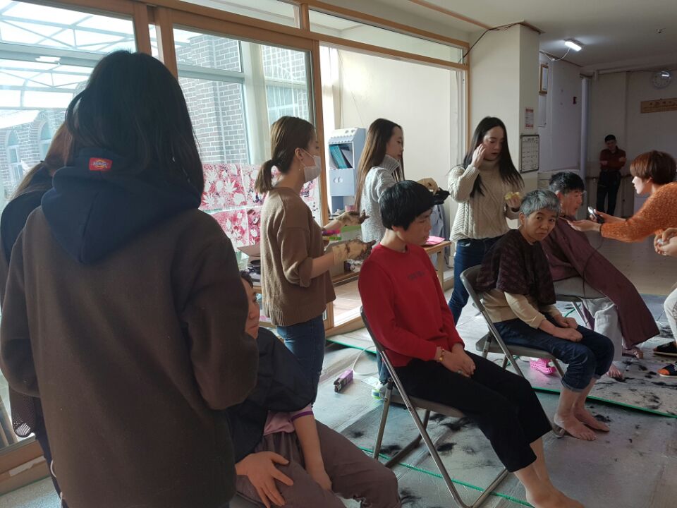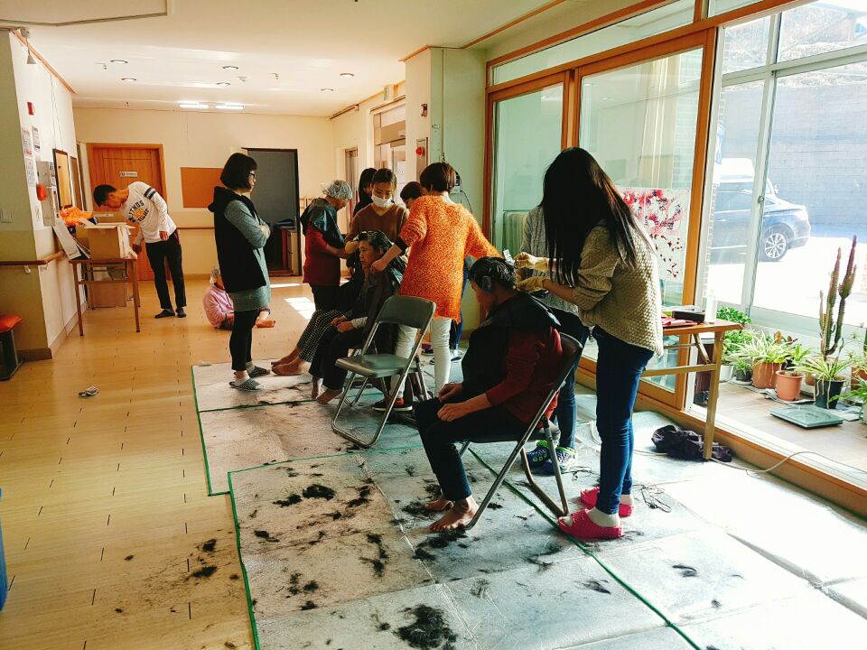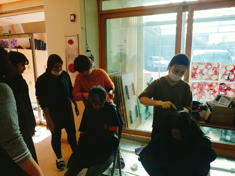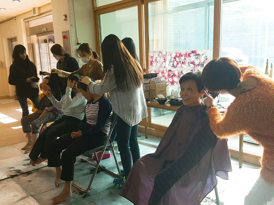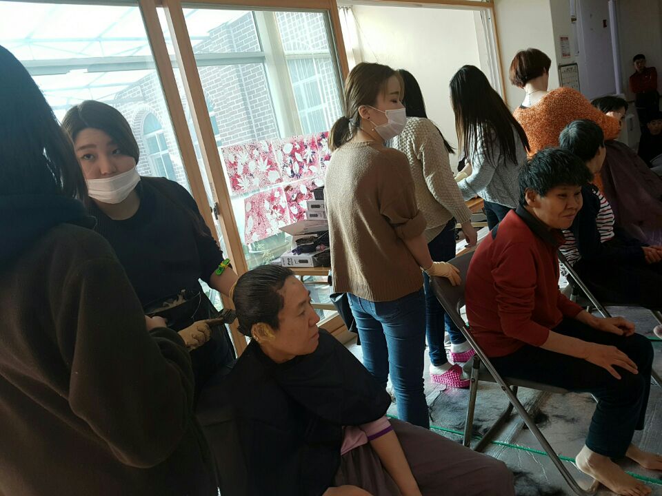 저희 뷰티디자인과 학생들은 어른신들께 염색과 헤어커트 서비스와 손마사지 네일아트를 해드리는 봉사를 하였습니다