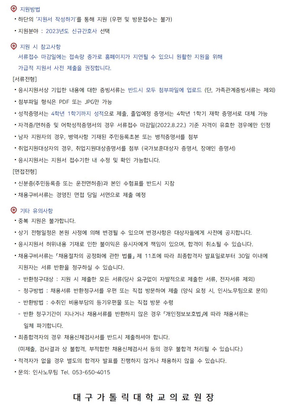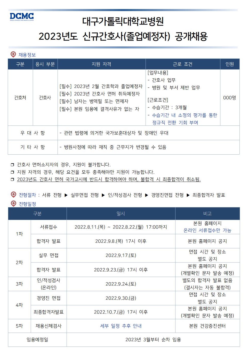 [대구가톨릭대학교병원] 2023년도 신규간호사 채용공고